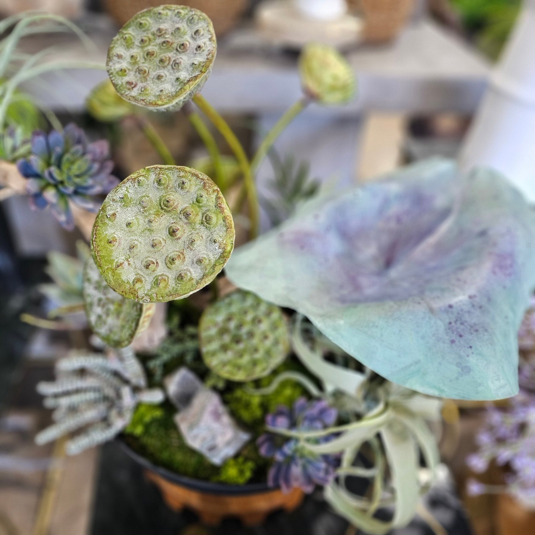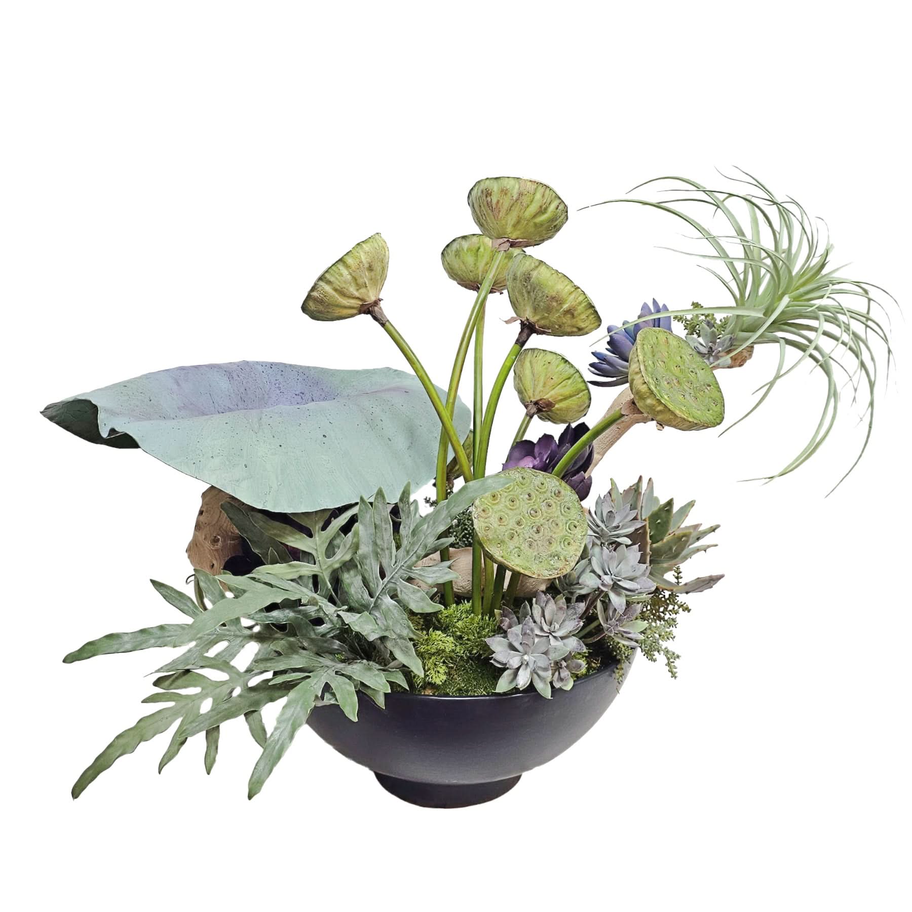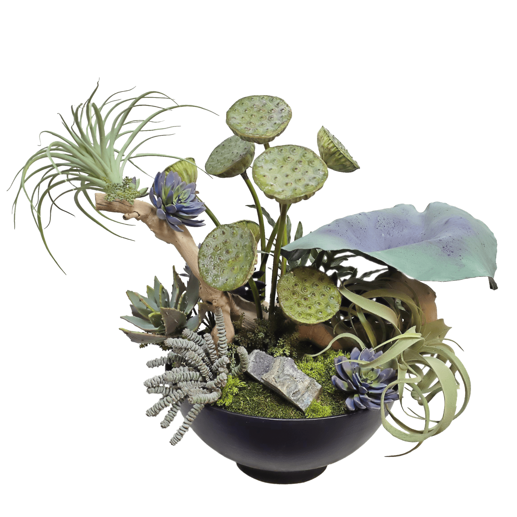 Type: Hand Painted Leaf, Specimen Amythest, Lotus Pods, Java Fern, Burro Tail, Baby Tear, Echeveria, Tillandsia, and Grapewood