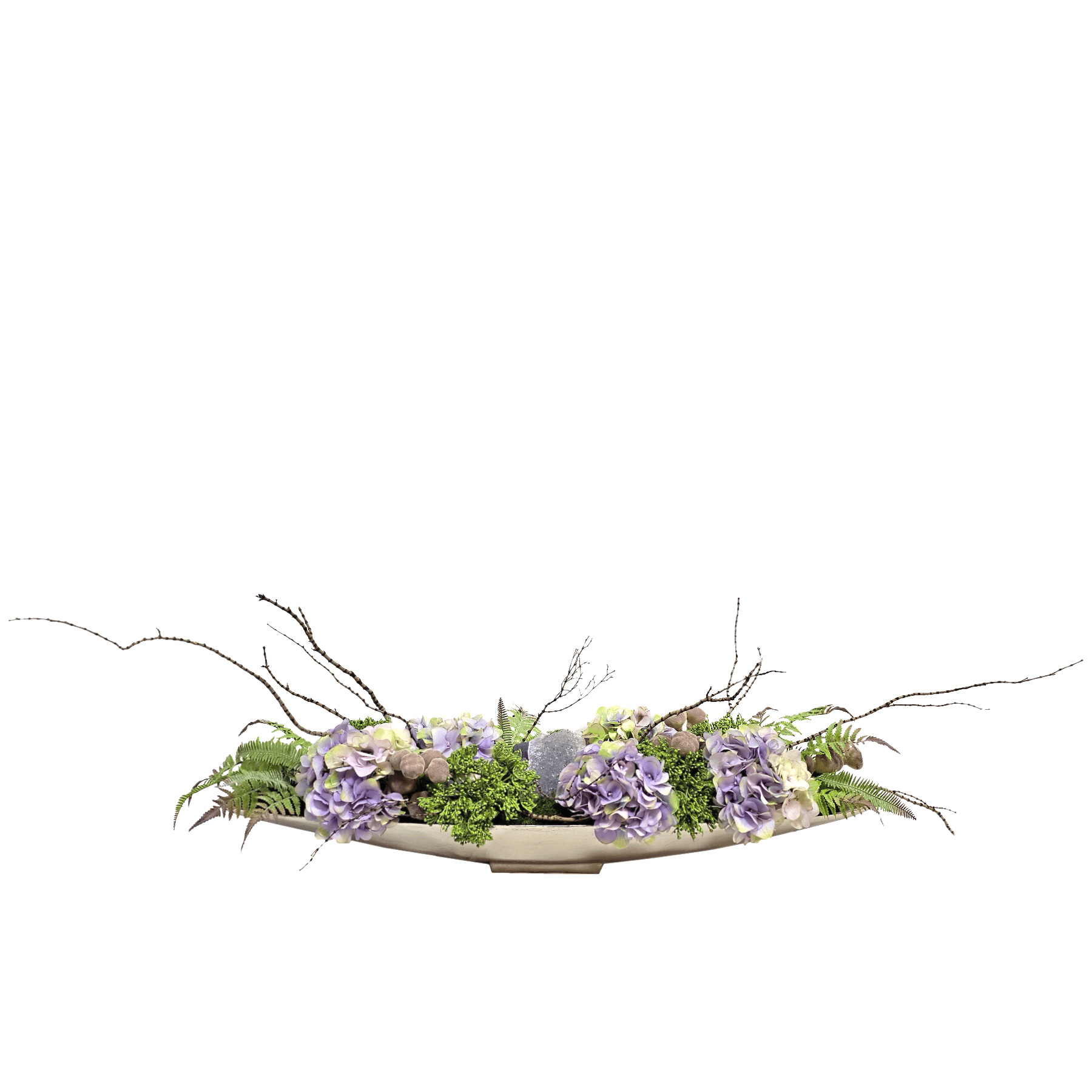 Type: Hydrangeas, Large Amethyst Crystal, Ferns, Figs and Tiger Wood