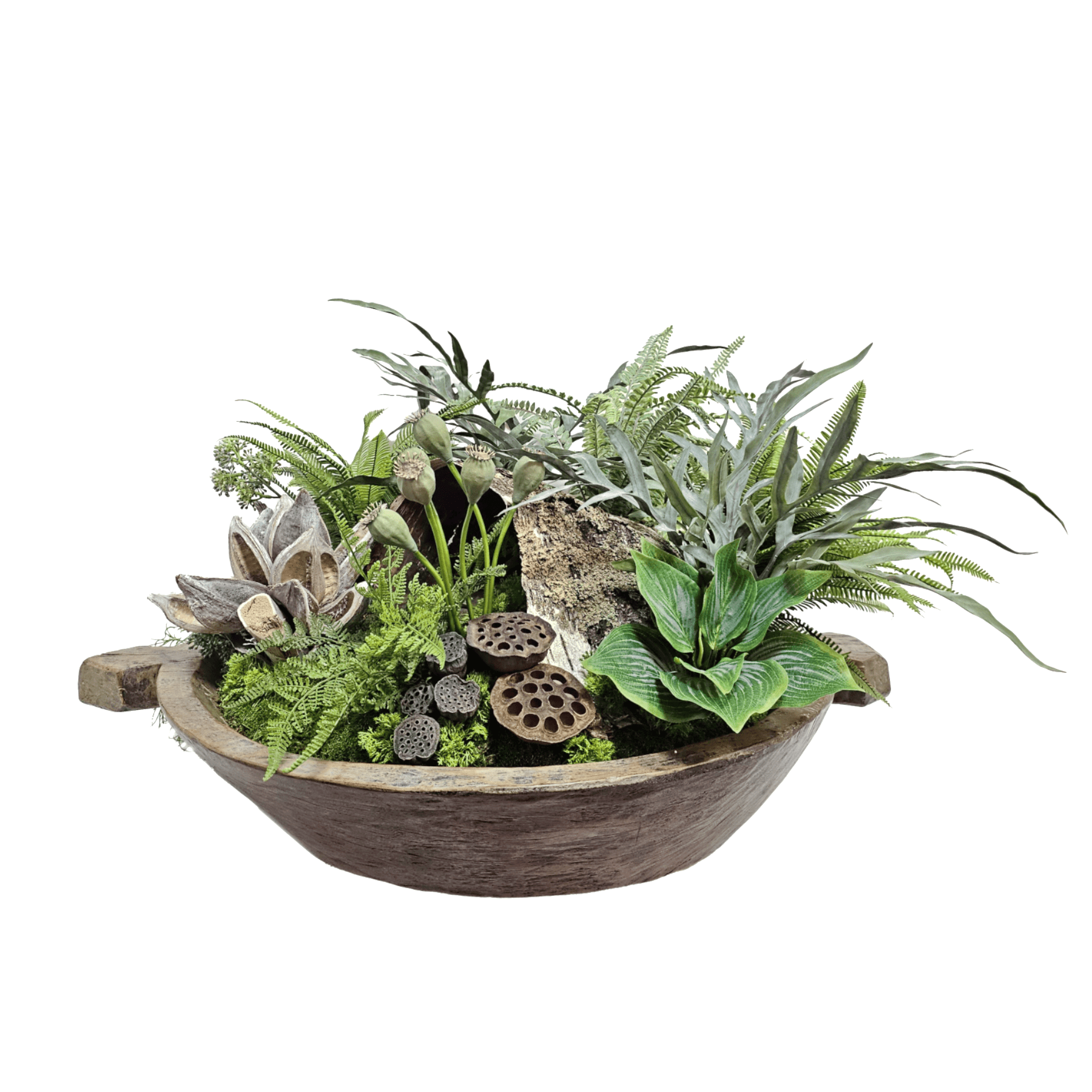 Natural Birch Bark with Mixed Fern, Sora Star, Driftwood and Lotus Pods in Antique Dough Bowl 20"H - LDF Silk