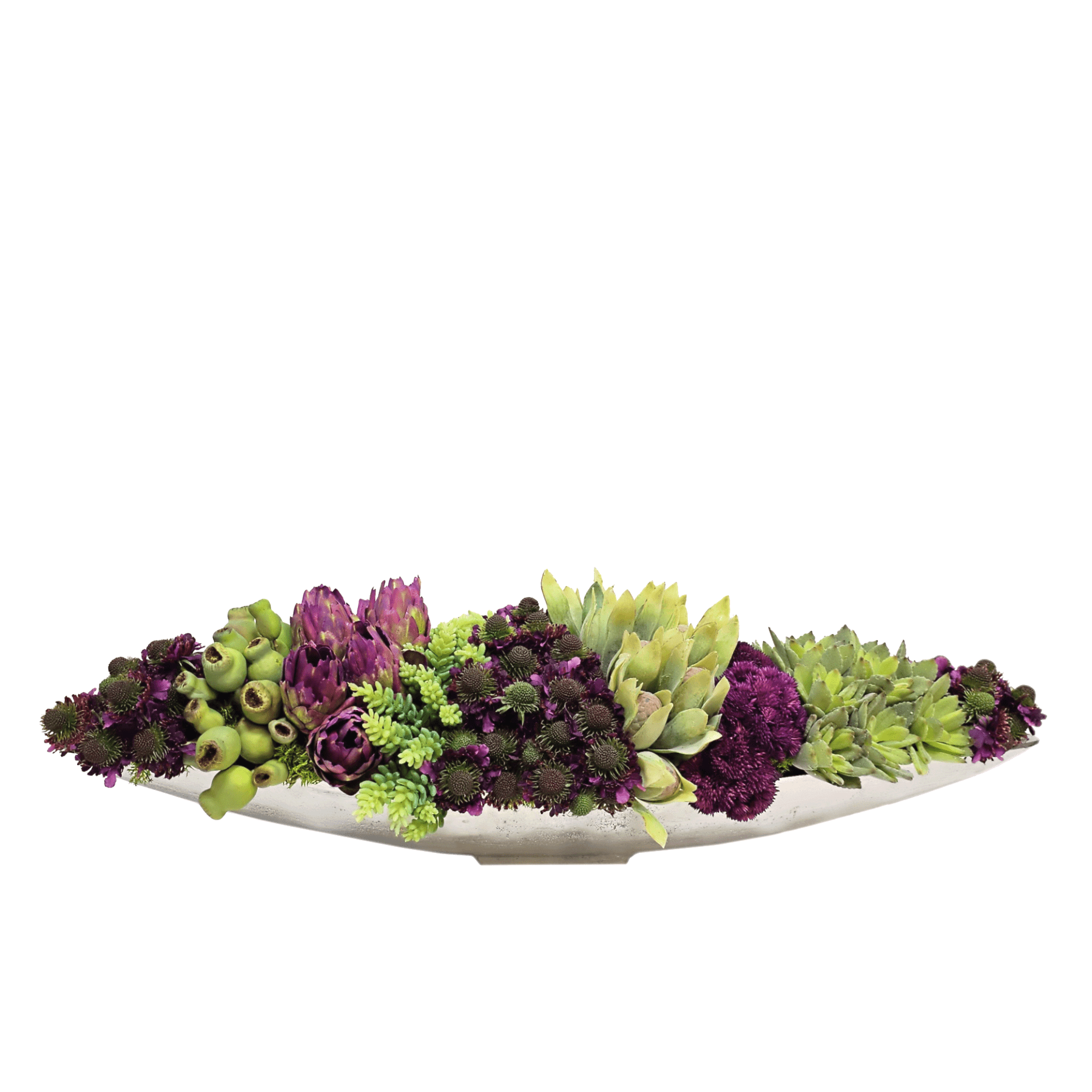 Protea, Scabiosa, Sedum, Agave and Pods in Metal Boat 9"H - LDF Silk