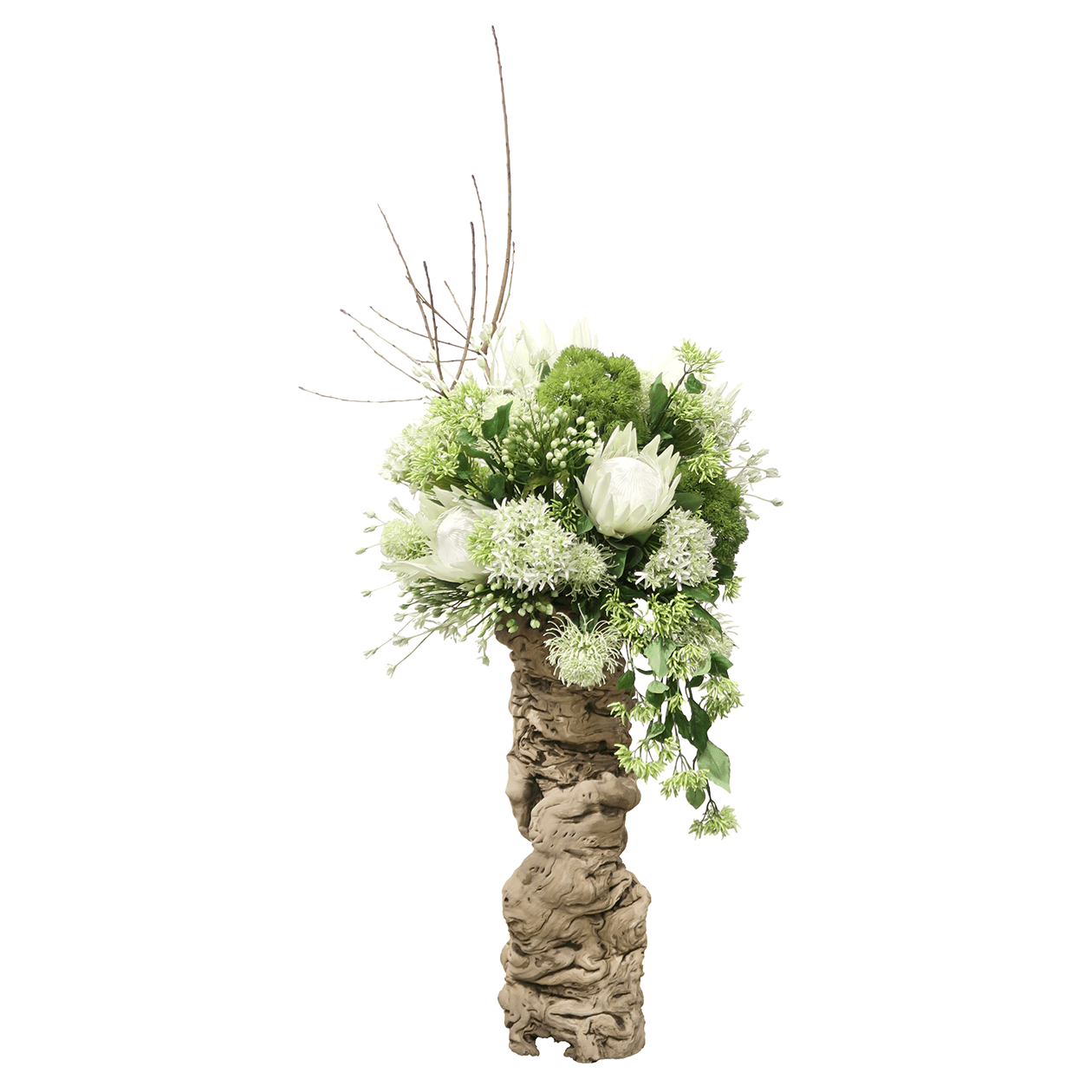 Type: White King Protea, White Allium, Dogwood Seed Spray, Blooming Protea, Giant Allium, Agapanthus and Sedum Spray