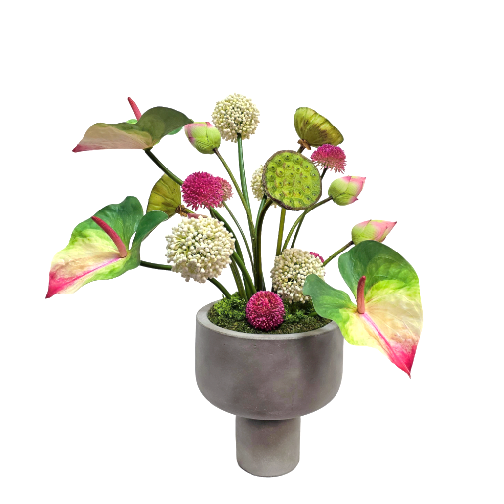 Anthurium Leaves, Lotus Pods and Buds with Allium in Concrete 29"