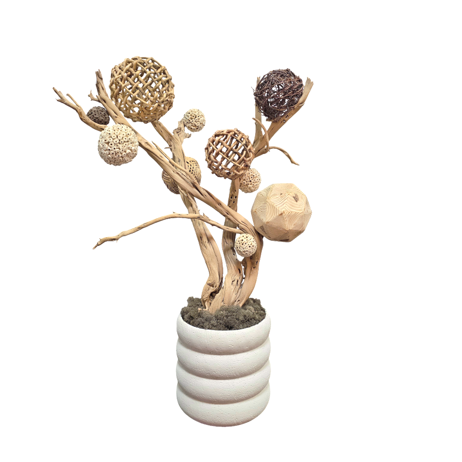 Mixed Greenery Spheres on Sandblasted Ghostwood Sculpture. 70"H (Each Sculpture will be Unique.)