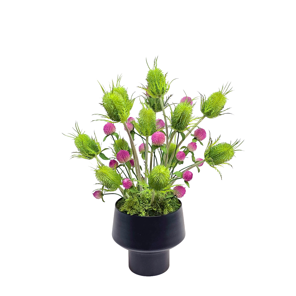 Artichoke, Thistle, Sedum, and Allium in Ceramic Pot 10"H
