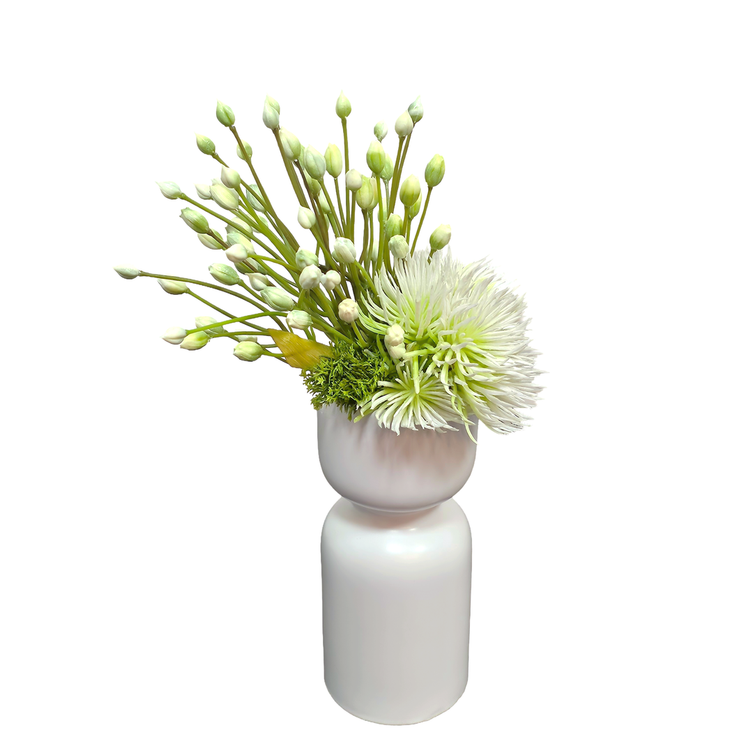 Split Philo Leaf, Allium, Pompon Blossom, and Cypress Bloom in Textured White Ceramic Vase. 20"H