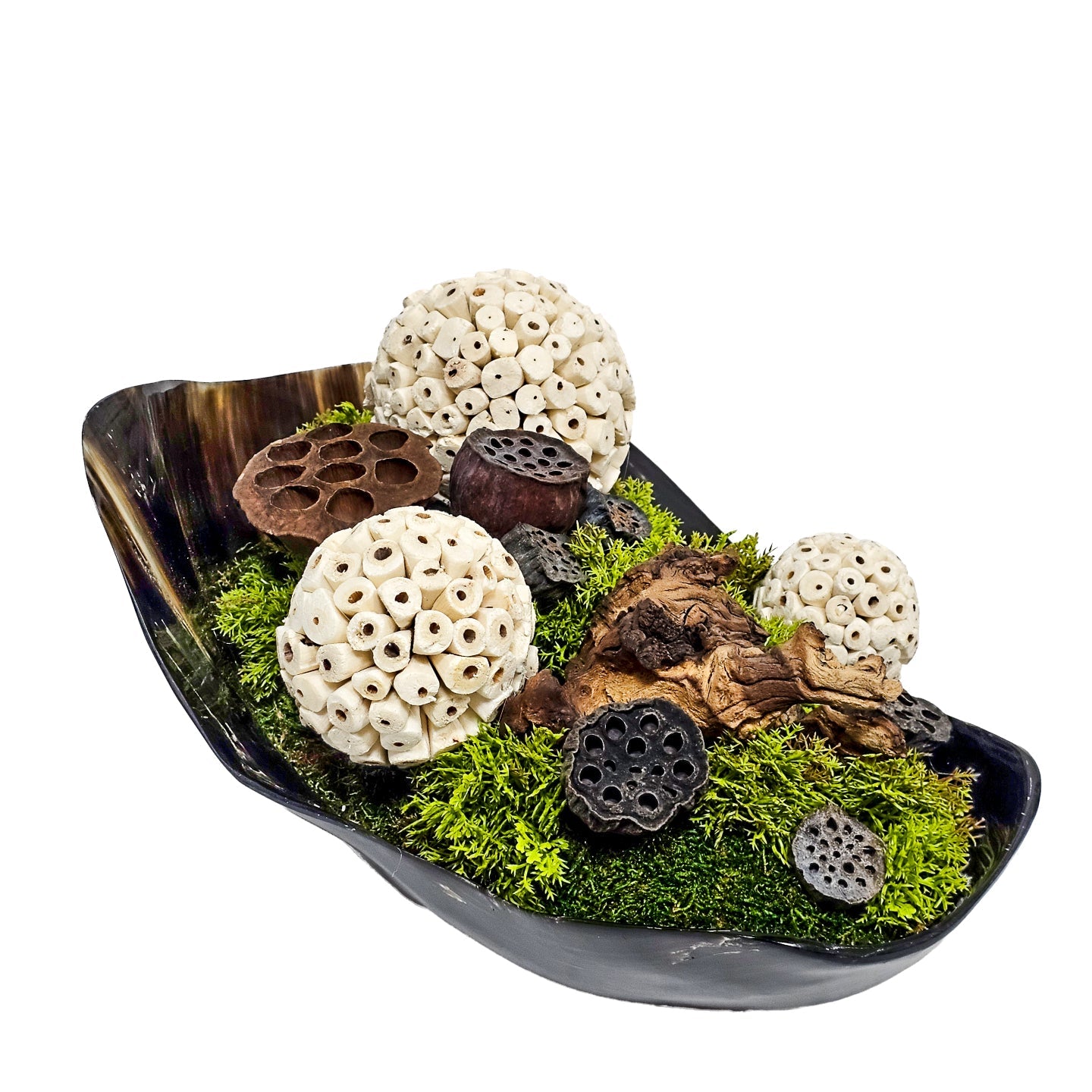 Natural Fiber Spheres with Dried Lotus Pods and Mosses in Carved Horn Bowl. FH: 7"H - LDF SilkArtificial Flora